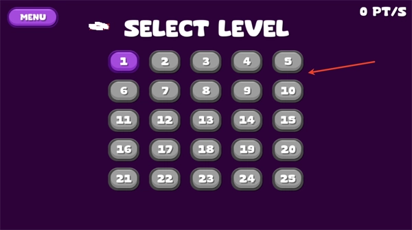 1、在关卡选择界面点击第5关(红色箭头指示),进入游戏场景。