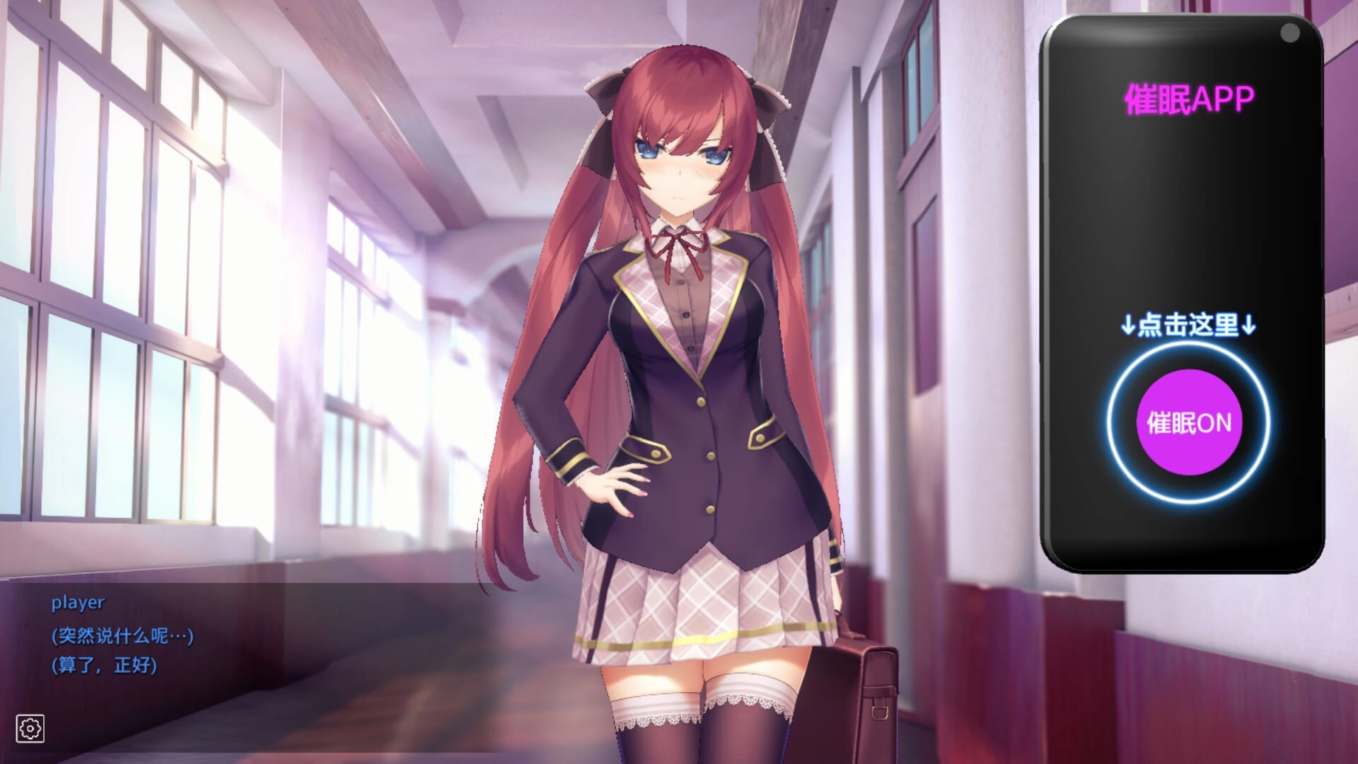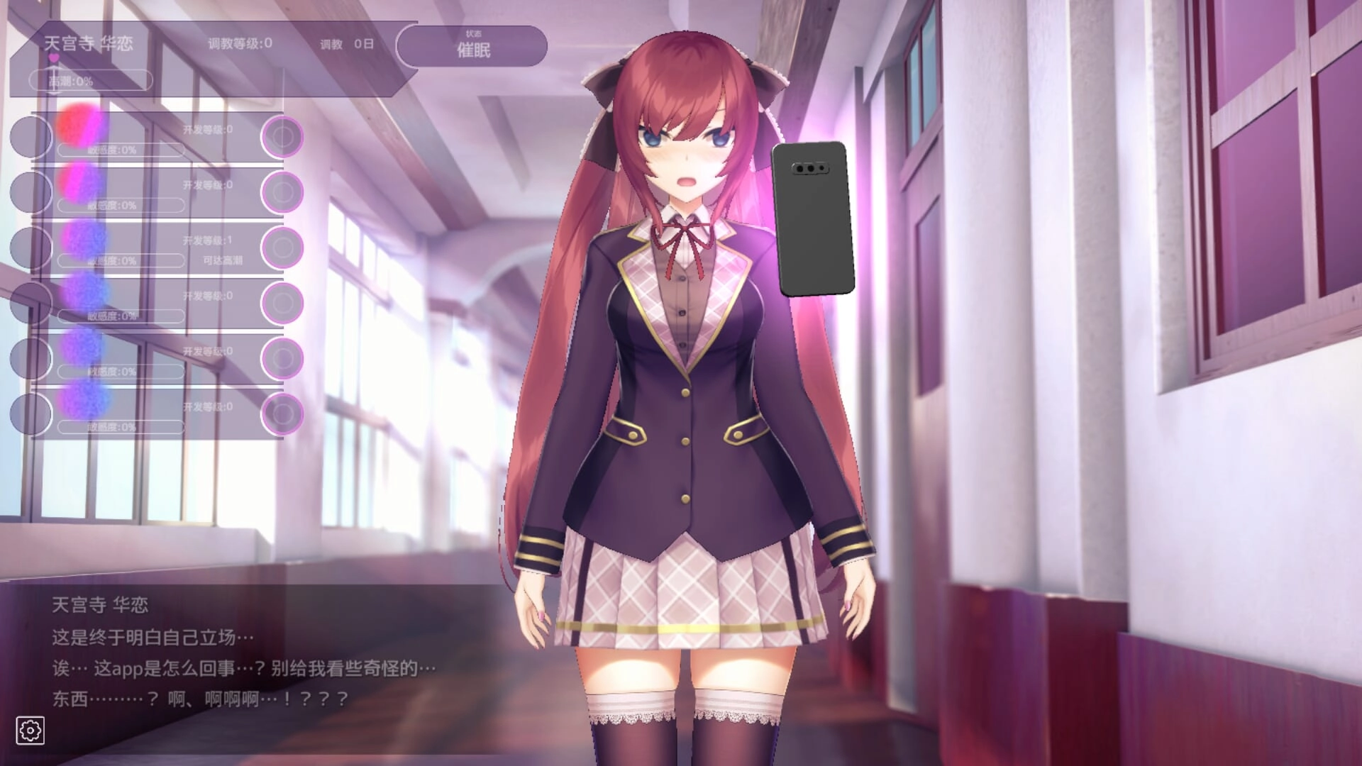 6、首次互动时,点击右侧手机界面的“催眠ON”按钮,触发天宫寺华恋的异常反应,进入调教系统界面,正式开启游戏核心玩法。