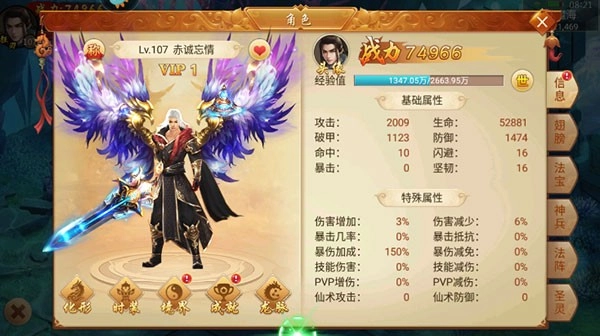 打开角色面板,你能在此查看角色的属性详情,角色的化形、境界晋升以及时装穿戴等操作也都可以在这里进行。