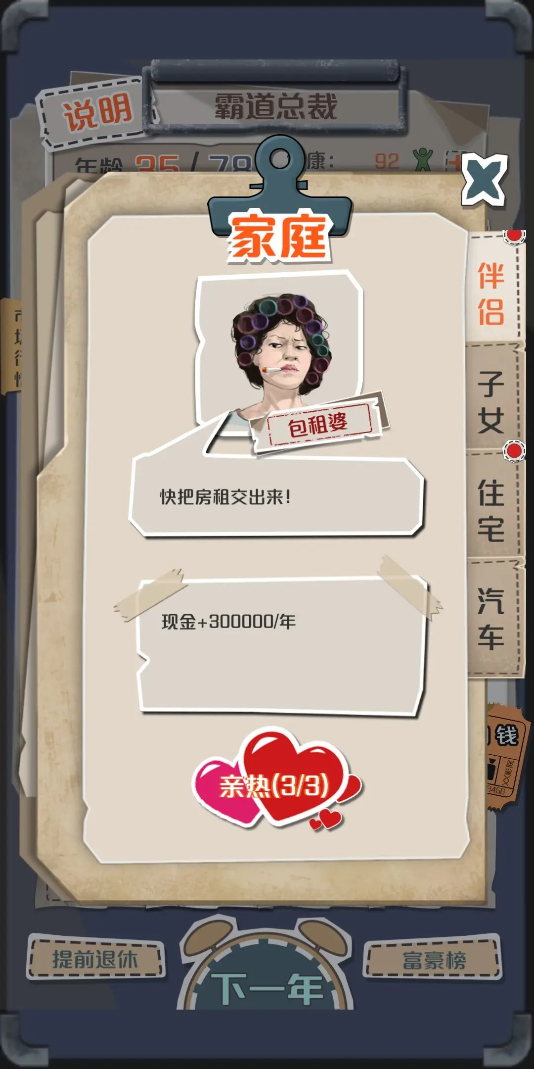 现代篇开局技巧:优先寻找强力伴侣获取启动资金→专注倒卖高收益商品(比特币、域名等)快速积累→3000万资产后转型金融投资→适时购置产业获取持续收益。注意健康管理,避免频繁赌博导致破产。