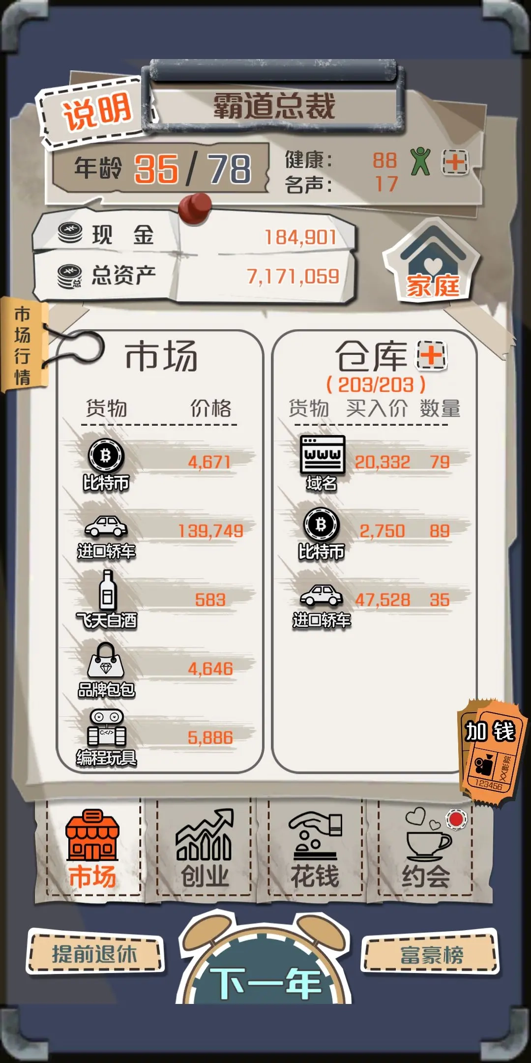 触屏操作流程:进入游戏选择休闲/竞技模式→查看市场行情与资产状况→点击商品低买高卖→仓库管理及时出货→利用资金创办公司→平衡娱乐消费与健康值→邀约NPC提升好感结为伴侣。