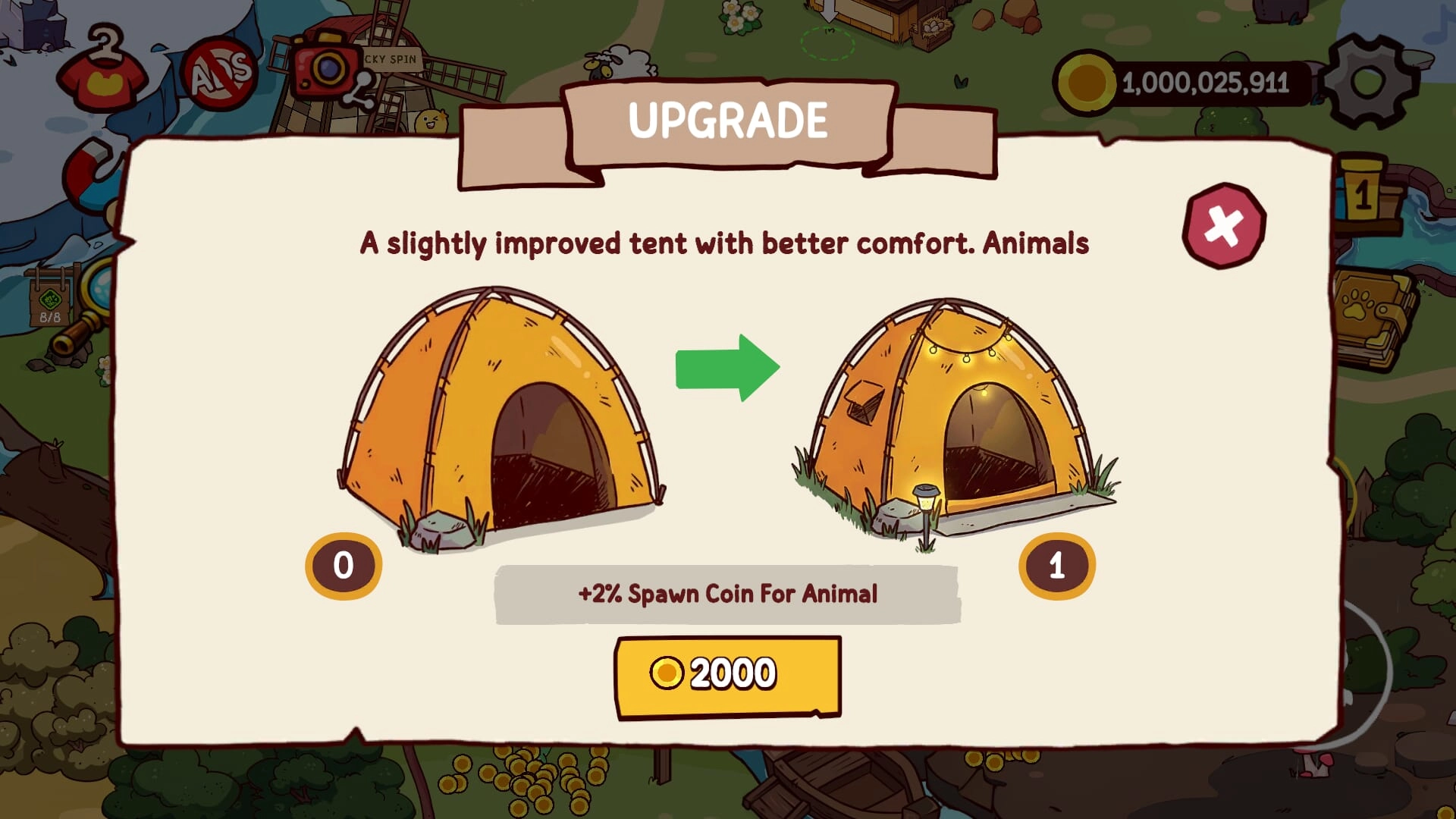 3、点击“UPGRADE”帐篷升级界面,花费2000金币可提升帐篷等级,获得+2%动物产币加成,建议优先升级以提高收益效率。