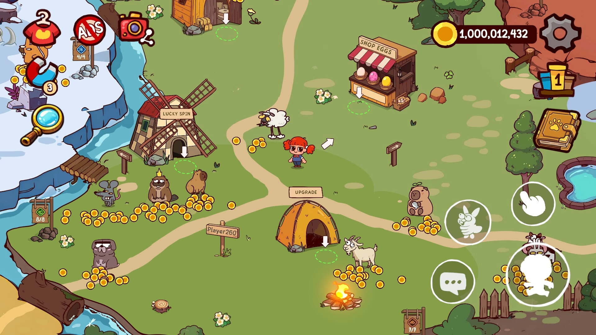5、点击动物(如羊、水豚、山羊)可触发互动,收集散落金币;部分动物需特定条件(如升级帐篷、解锁道具)才能高效产出。