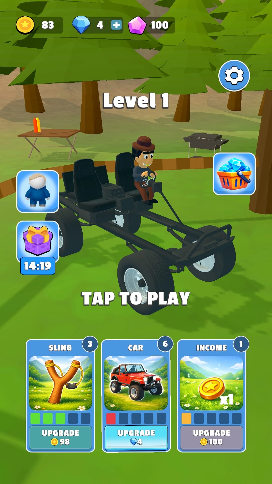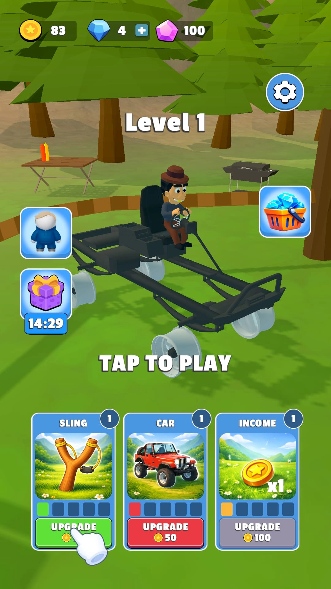 1、在主界面点击“TAP TO PLAY”进入游戏,初始载具为未组装的车架(仅轮子+座椅),需先完成弹射准备。