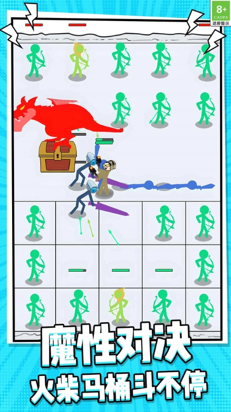 简约却不失深度的火柴人美术风格,配上极具张力的战斗特效,营造出别具一格的视觉感受。单局3至5分钟的极速对决,精准契合碎片化时间的使用场景。兵种、技能与阵型的搭配方式层出不穷,助你打造专属于自己的战术系统。