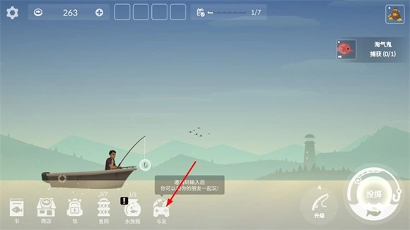 4、抓鱼任务:点击书本标志接任务,完成后获金币,用于购买渔具或升级船只。