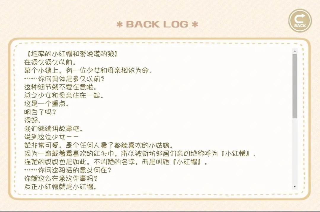 以小红帽的角色进入游戏,在和大灰狼的一连串对话里做出选择。