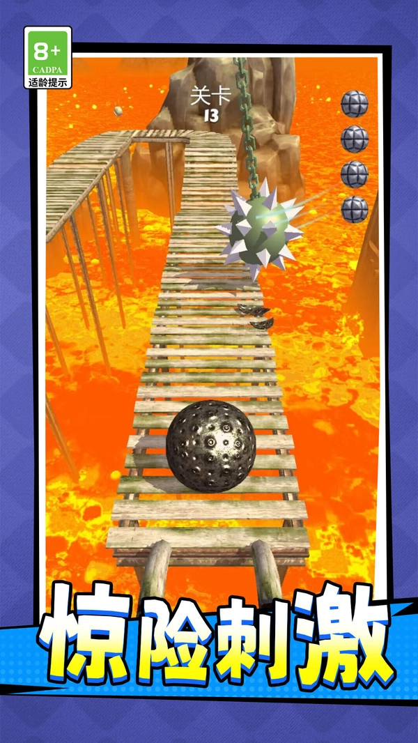 通过简易的滑动操作即可完成精准的方向把控与速度调节,搭配经过优化的物理引擎,呈现出流畅且逼真的滚动反馈。2、打造了火山喷发区域、湍急水道、机械迷宫等多样化的主题场景,每个场景里都配置了和其环境深度融合的特色机关。3、在紧张刺激的逃生主题背景下,游戏凭借流畅的操作反馈、明快轻松的卡通视觉风格以及清晰可达成的阶段性目标。