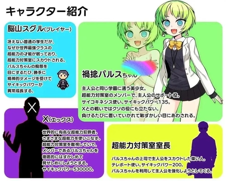 角色设定鲜明,玩家扮演天才学生,搭配使用念力的美丽女孩“不幸脉冲”,个性互补。