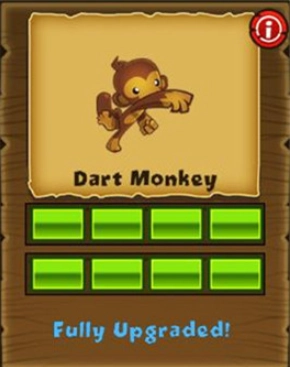 飞镖猴:射程中等,偶像为超猴。路径一:长距离飞镖→视力加强(反迷彩)→刺球投石机(攻18目标)→主宰者投石机(破陶瓷/铁质)。路径二:锋利飞镖(攻2目标)→超锋利飞镖(攻3目标)→三连镖→超猴粉丝俱乐部(变身超猴)。