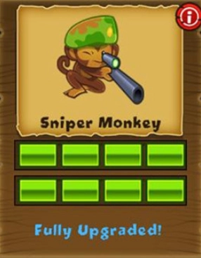 狙击手猴:全屏射程,攻速慢。路径一:合金弹头(破4层)→第五点射击术(破7层)→死准(破13层)→跛子汽艇(减速)。路径二:快速开火→夜视仪(反迷彩)→半自动来复枪(射速×3)→空中支援(送资金)。后期秒杀陶瓷气球。