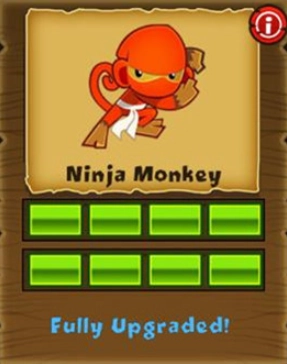 忍者猴:原型为蛇眼和白幽灵。路径一:忍者信条(增射程/速)→锋利手里剑(攻4目标)→双倍攻击→白幽灵(五手里剑)。路径二:追踪手里剑(自动瞄准)→分神手里剑(气球倒退)→闪光弹(群体眩晕)→蛇眼(减速气球)。