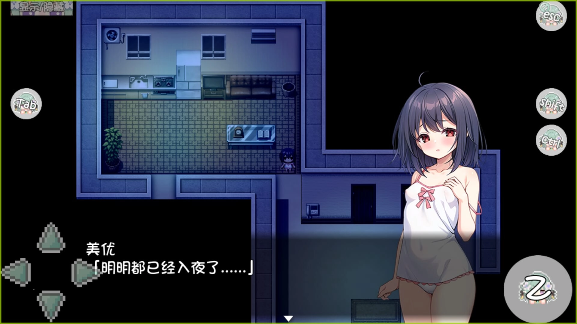4、进入房间后,主角美优喊出“妈妈!!”但未找到人,随后说“好像不在这里”,此时需主动移动探索:使用方向键控制小人走遍卧室、客厅等区域,触发后续事件。