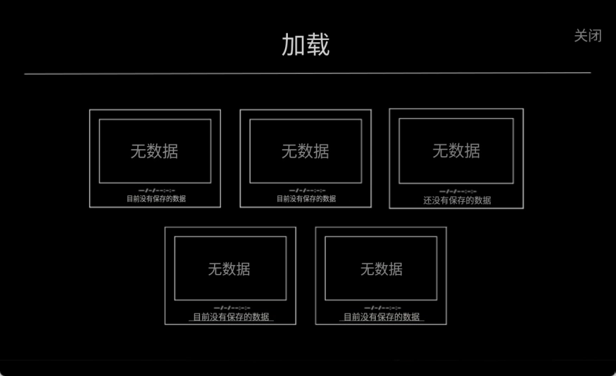 3、加载界面显示5个空存档位,当前无存档,需先游玩并手动保存才能续玩。