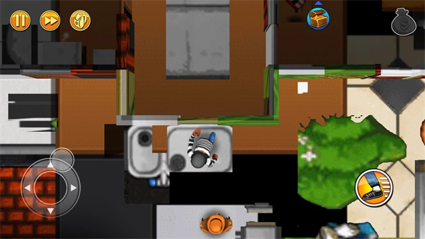 游戏开始后,我们会进入别人家的房间,能够操控人物前进。游戏里那些闪光的位置就是可以获取金钱的地方,而有宝箱的地方往往是金钱最多的区域。此外,点击右下角的跑步按钮可以加快移动速度,但这个功能不能一直使用,存在冷却时间的限制。