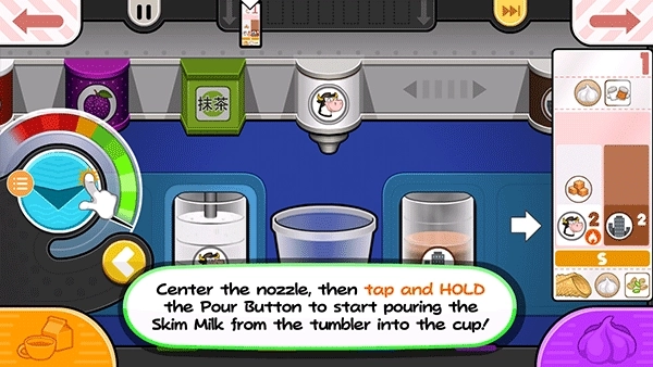 15、从奶票左侧的项目处开始拖动容器,让左边的脱脂牛奶杯喷嘴对准杯子上方的中心位置。按住倒奶按钮持续添加脱脂牛奶!要是仪表指针快要接近红色区域,就松开倒奶按钮,等指针降下来后再继续倒!