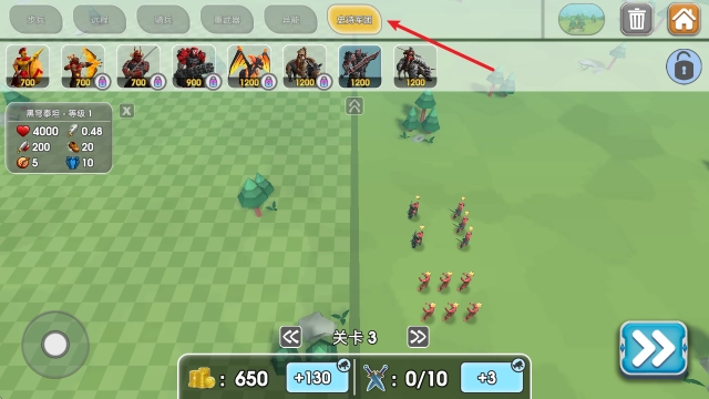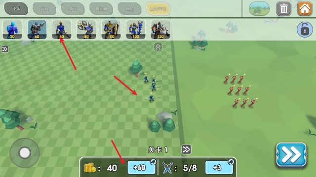1、游戏启动后,点击界面上方的士兵单位,将其部署到指定的战场区域即可开始作战。需要注意的是,每一个关卡都有对应的金币消耗限制。