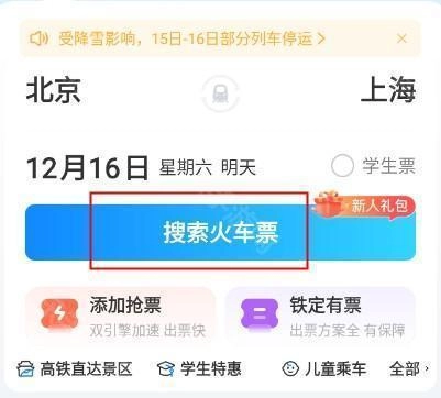 1、打开高铁管家,输入行程的起点跟终点站,选择购票的日期,点击搜索火车票按钮。