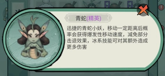 迅捷的青蛇小妖,在移动一定距离后有概率触发爆发性移速加成,同时减免部分击退效果;冰系技能对它能造成额外伤害。