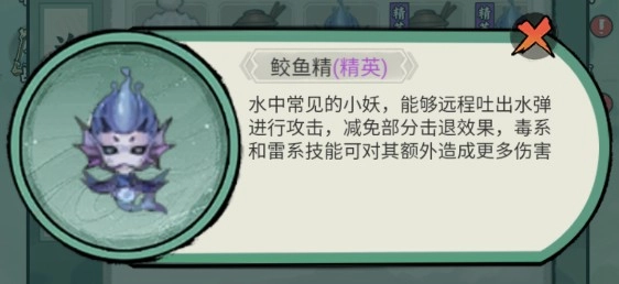 水中常见的小妖,擅长远程喷射水弹发起攻击,具备一定的抗击退能力,毒系与雷系技能对它能造成额外伤害。