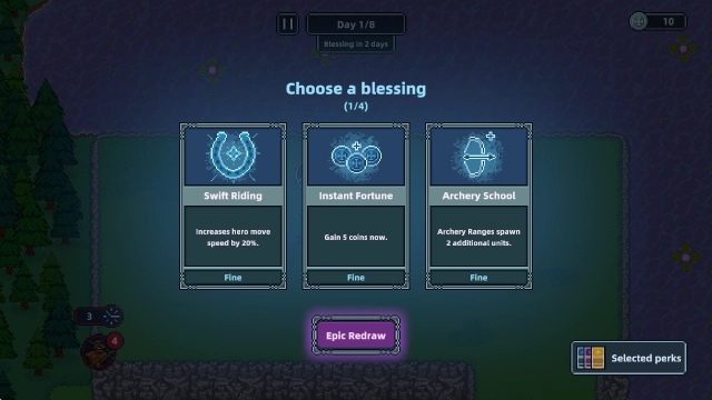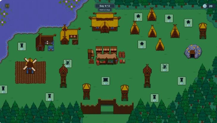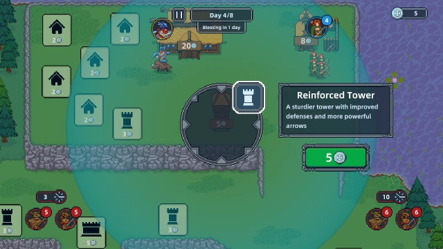 3、成功消灭敌人后返回白天,使用硬币升级并扩建设施。