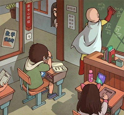 穿蓝色衣服的男生,书本里夹着一本漫画书,点击漫画书就可以了。