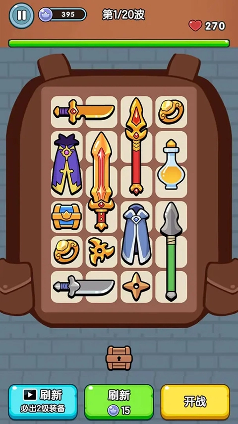 玩家在进入关卡前,可先挑选装备再开始游戏。只需把下方的装备拖到九宫格里就行,只要格子能放下,所有装备都可以带上哦。