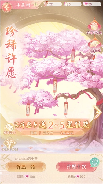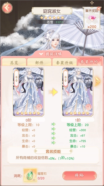 掌柜可以用钻石或许愿璀钻来许愿获取服装,每隔一段时间会有一次免费许愿的机会。如果重复获得了服装,还能将其分解,从而得到套装升级和升阶所需的材料。而套装的升级与升阶,能够提升掌柜的势力。