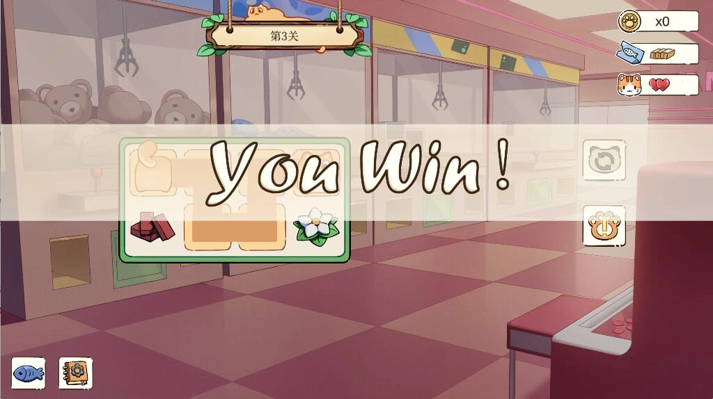 4、第3关为迷你解谜关卡:在限定路径中将猫咪头像移动至终点(避开障碍物),成功后弹出“You Win!”提示并获得奖励;失败可点击右上角重试按钮重新挑战。