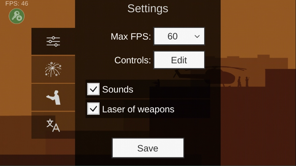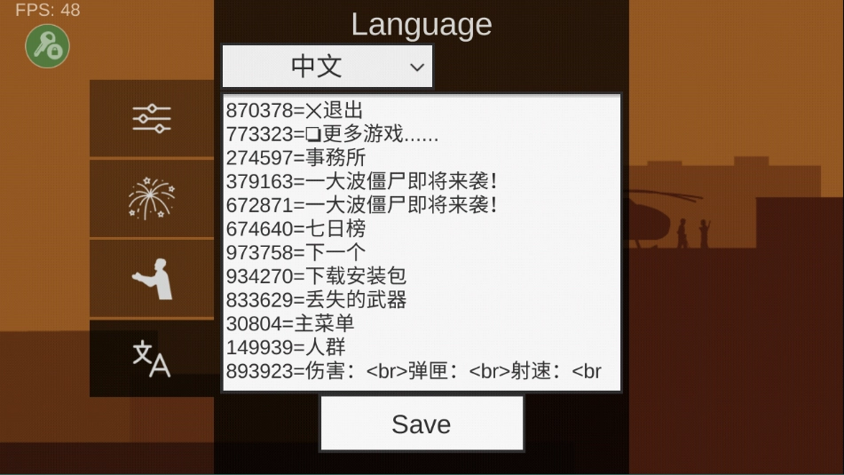 确认选择后点击右下角的【save】按钮,语言变更会立即生效,不需要重启游戏。