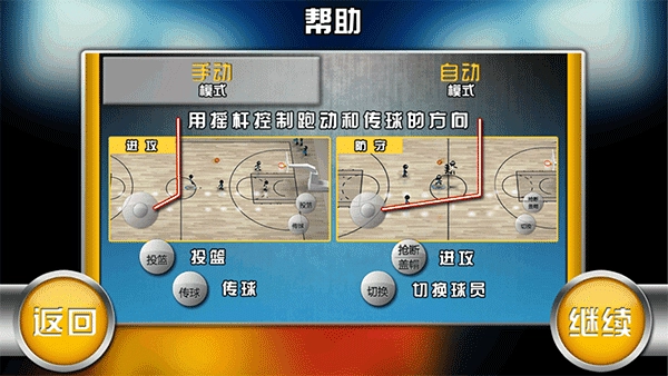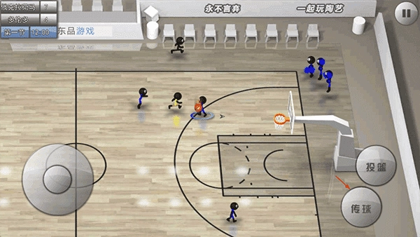 虚拟摇杆操控全场移动,两个核心功能键会根据攻防状态智能切换作用:进攻时可完成传球、投篮、突破,防守时能触发抢断、卡位、争抢篮板,在简化操作的同时保留了策略深度。