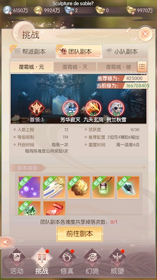 挑战修真副本时,建议组满6人小队,并且队伍里最好包含妖兽和羽灵这两个职业,这样才能更顺利地通关。