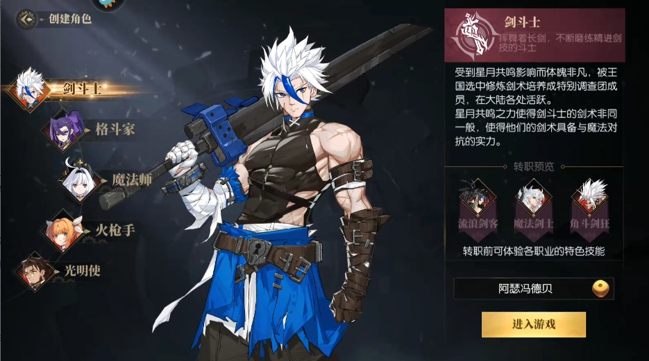 游戏里共有五个职业,它们分别是剑斗士、格斗家、魔法师、光明使和火枪手。