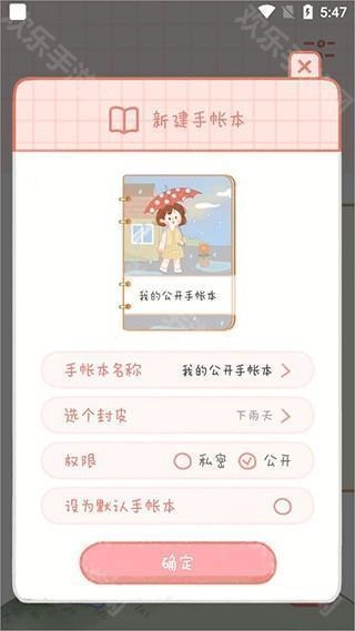 新建手账时,你可以为其设置名称、封皮、权限,还能选择是否设为默认手账,确认后就能完成新建。
