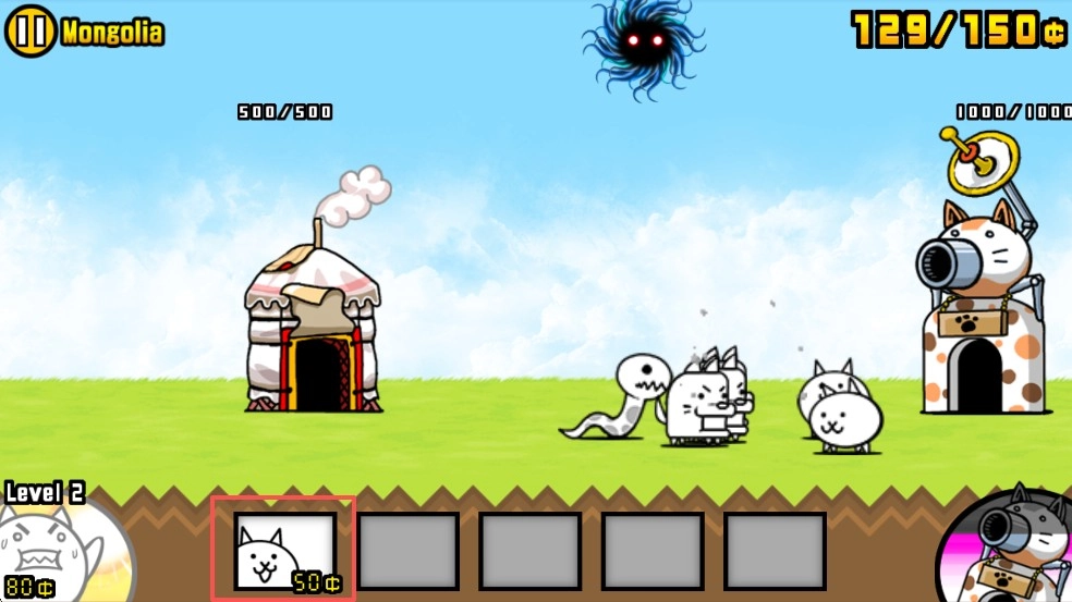 进入游戏后,你会看到两座塔:一座属于敌方,里面会不断生成敌对生物;另一座是己方的,不仅能产出猫咪士兵对抗敌人,还能释放激光瞬间消灭敌人,不过这两种功能都有冷却时间。