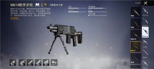 MK14是游戏里伤害最高的连狙,不仅伤害高还能连点,实际表现完全不输给AWM。只要给它配上托腮板,连点时的手感会很顺畅,用起来相当舒服。另外,MK14还是少数能全自动射击的狙击枪之一,另一把具备全自动功能的狙击枪是没什么人用的VSS。