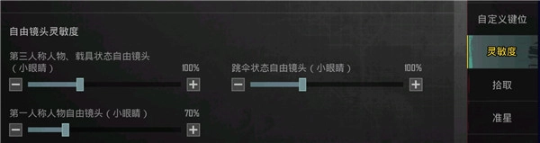 用第一人称视角滑动小眼睛时,和正前方呈垂直角度的视野效果更佳,建议把这个设置调整到70%;处于跳伞状态时,镜头灵敏度推荐调到120%,这样能更迅速地发现其他队伍的情况,也方便及时报出他们下落的大概位置。