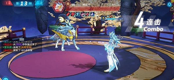 我们先让花冠公主和神武月登场,花冠公主的作用是主动牺牲自身来削弱兔子的属性,这一步多少有点看运气,我们得尽可能把兔子的属性削弱到最低。这时候神武月就在旁边低调发育,要是血量不够就用3技能回血,建议先放两次上古血脉;要是开局运气不好直接被秒了,那就逃跑重新开始战斗。