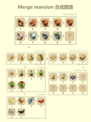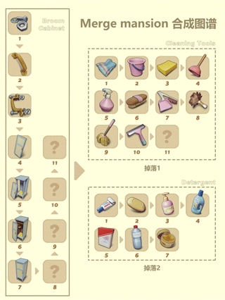 棋盘中的物品主要有两类,一类是产出源道具,另一类是合成物品;其中,产出源道具通过点击能够获取各类合成物品。