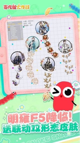 贪吃蛇大作战oppo账号登录版是一款休闲益智游戏,玩家将操控一条经典形象的贪吃蛇。除了能吃掉游戏里的能量点来增大体积,游戏还对经典玩法进行了升级,加入了蛇吃蛇的设定。这款游戏不会因为不小心撞到自己的身体而失败,难度相对较低。玩法很简单,玩家需要不断进食各种东西来让自己的身躯变得更庞大。而蛇吃蛇的设定意味着,玩家可以用自己的身体触碰敌人的头部,让敌人死亡并留下食物,供自己进食。这一设定让玩家在身躯变大后需要更加谨慎,避免撞到其他敌人导致前功尽弃;同时,玩家也可以在刚复活时以小博大,撞击较长的蛇来快速发育。