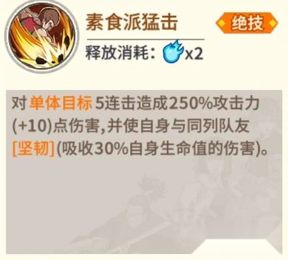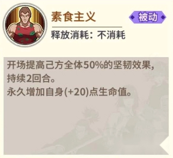 在协会竞技里,背心素食派因为自身绝技伤害不高,所以不用施放绝技,他的被动技能搭配极限甜心假面或者背心这类带有【坚韧】效果的角色时,能带来质的飞跃。