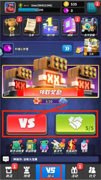 进入【战斗界面】后,能看到玩家的奖杯数量、任务、排行榜与成就,还可以领取奖励。其中【VS】是单人匹配模式,【5/5】为好友组队模式,选择所需模式即可开启游戏对战,以下以【VS】为例进行说明。