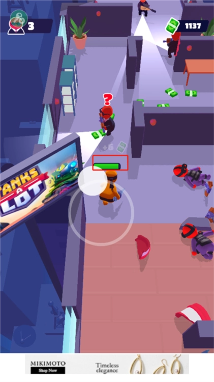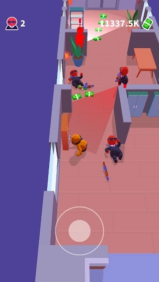光线覆盖的区域属于敌人的监控范围,玩家只要避开这些区域,敌人就不会发起攻击;而玩家只需悄悄接近,就能解决掉小喽啰并获得钞票奖励。