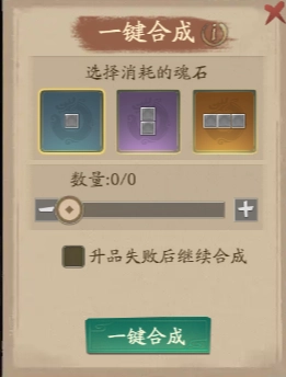 所以非纯色的魂石在大多数情况下只建议使用【一键合成】功能,当合成2级及以上魂石时,可以勾选【纯色魂石不参与合成】选项,这样就能保留少量2格的纯色魂石了。