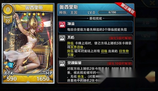 看不出来它强在哪里?那我来帮你梳理一下:目前唯一能让对方被动型和物理型技能失效的卡牌是蚀月骑士;唯一能让对方主动施放的技能失效的卡牌是易命之昭——这两张都是当前T0级别的魔族卡。而奥西里斯作为一张6合卡,却拥有和这些T0魔族卡同类型的技能,优势自然很明显。虽然它的技能有次数限制,但降临技能本身普遍强度高且难以反制,所以ban掉对方3个降临技能通常能带来不错的效果。