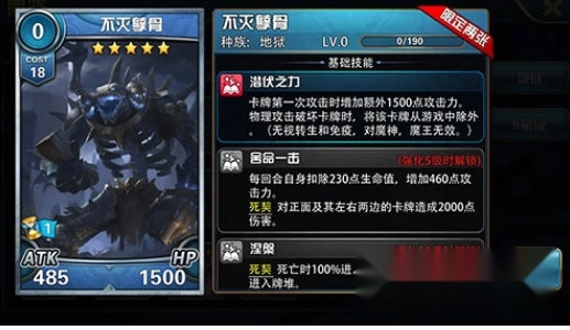 其实真没什么好说的,作为奥西里斯的副卡,不灭孽骨出场就能带来1960点的ATK加成,这数值足以一击解决掉大多数没有额外加成的卡牌;它的1CD涅槃技能能确保自身生存,而高达2000点的自爆伤害,也能在保全自己的同时,相当有效地压低对手的血线。
