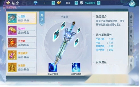 龙武里设有5大法宝,它们分别是七星剑、乾坤伞、火龙珠、紫金葫芦与东皇钟。每一件法宝都可以为玩家提升生命上限、攻击以及防御属性,不同之处在于各个法宝在属性加成上的侧重点有所差异,并且品阶越高的法宝,能够带来的战力加成自然也会更显著。