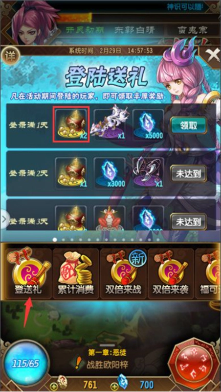 在“活动”界面中找到“登送礼”并领取登录奖励就可以了,登录奖励除了补天丹之外,还有其他各种各样的丰厚奖励。