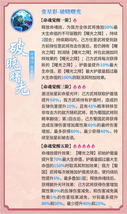 一是提升主动命魂技施加的“曙光之障”的上限,使其更难被击破,稳定性更强。二是进一步提高我方全体获取护盾的收益,让护盾在直接抵消伤害的同时,还能应对慢速抗队较为忌惮的灼烧伤害。三是释放主动命魂技后,大幅增强我方全体的坦度,提供两种抗性属性:降低受到的反弹伤害,以及珍贵的伤害结果减免。其中更出色的属性是伤害结果减免,最高可增加50%——要知道,曾凭借一己之力彻底改变整个环境的方圆阵,点满后也仅能增加30%-60%的伤害结果减免,且有回合限制!而命魂觉醒后的张星彩,一个被动效果就远超过去一整个阵法的效果,强度相当可观。