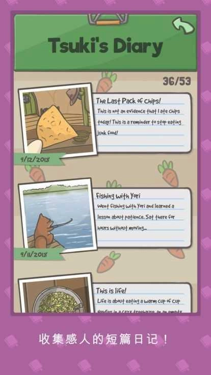 月兔冒险是一款Q版动漫风格的养成类游戏,和《旅行青蛙》有着相似的玩法。玩家将以第三人称视角,模拟并观察一只可爱的月兔在乡村的日常生活。在这里,你能看到月兔过着平静的日子——无论是白天外出探险,还是夜晚享用美食,这些场景都会清晰地呈现在你眼前。